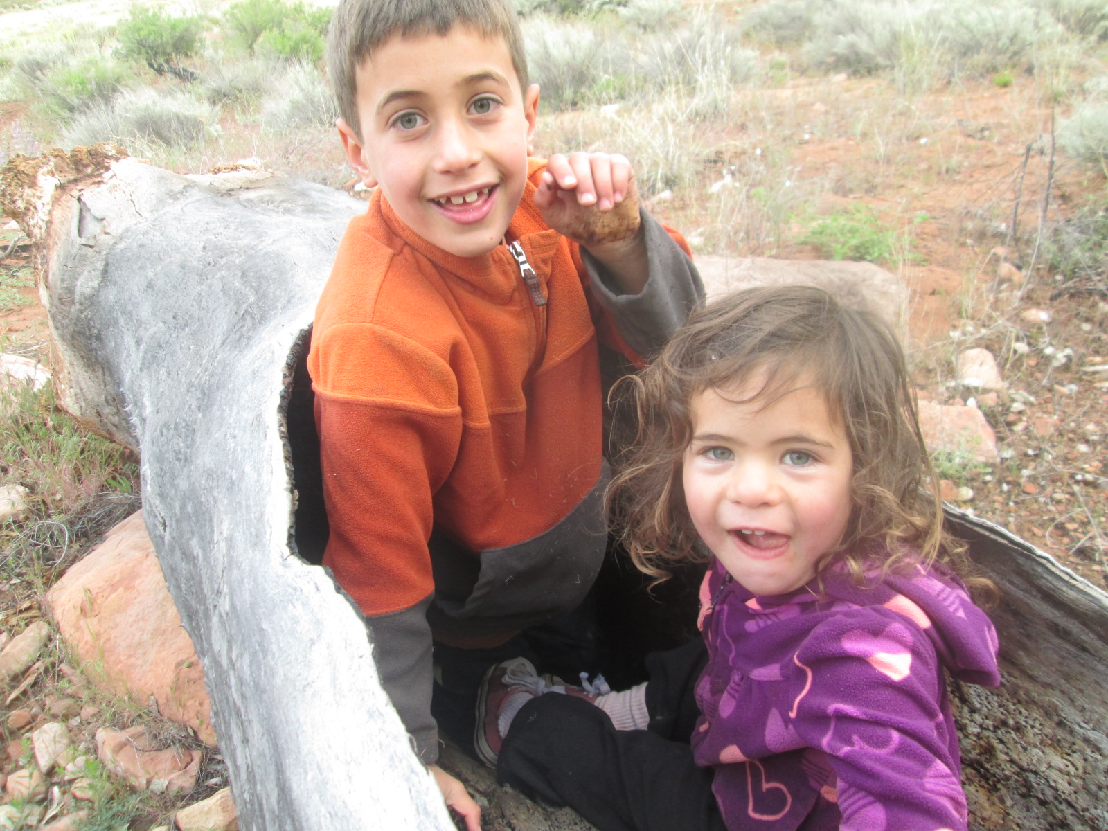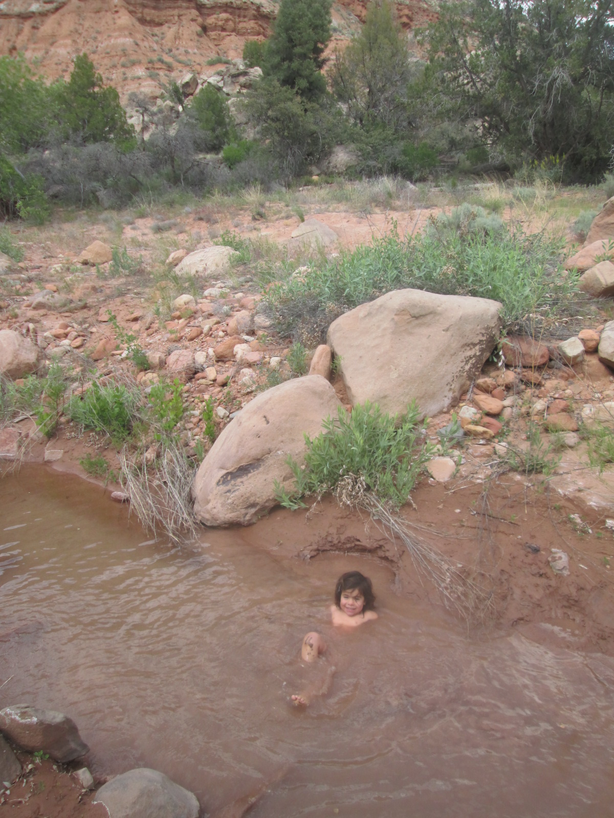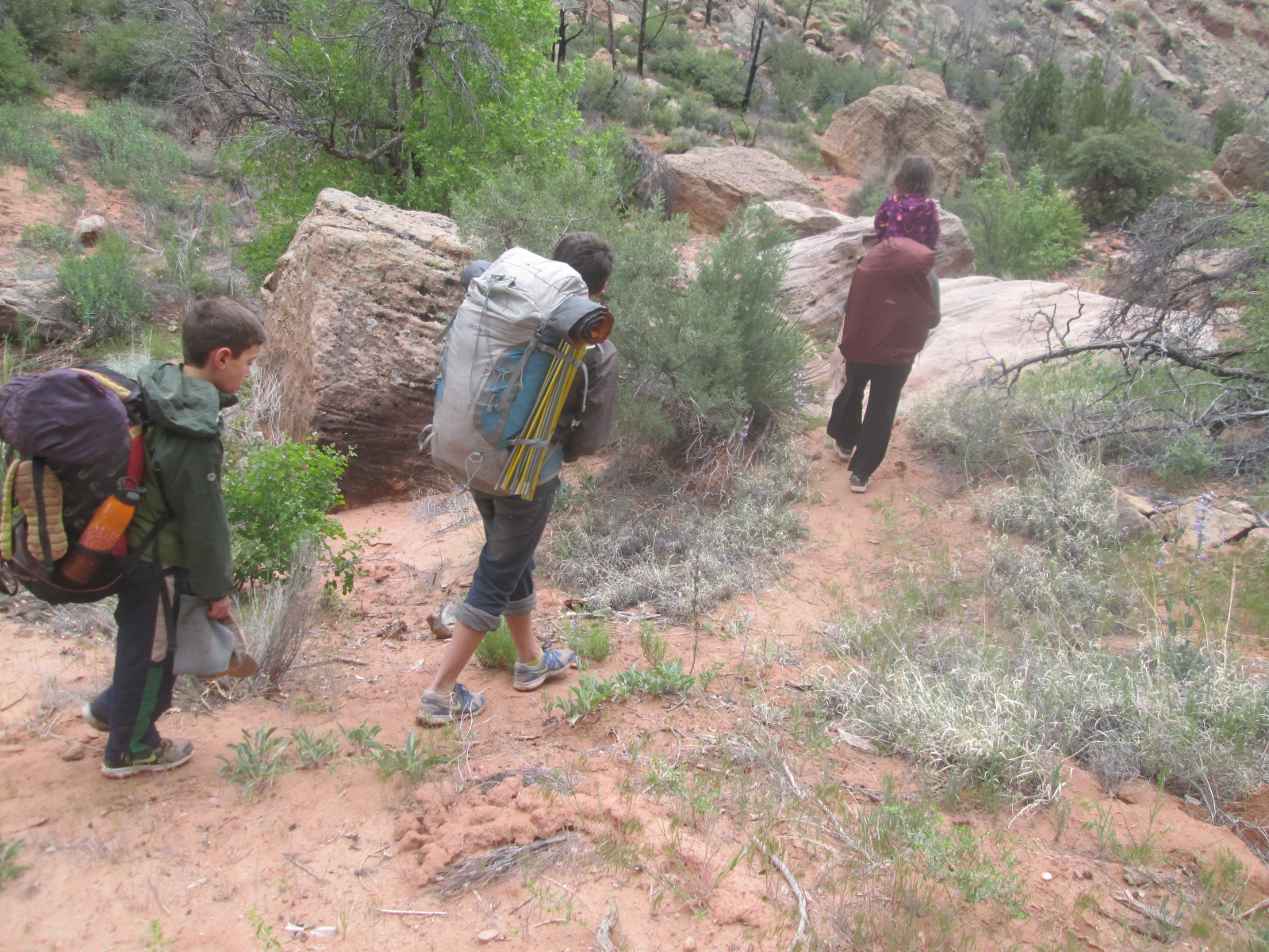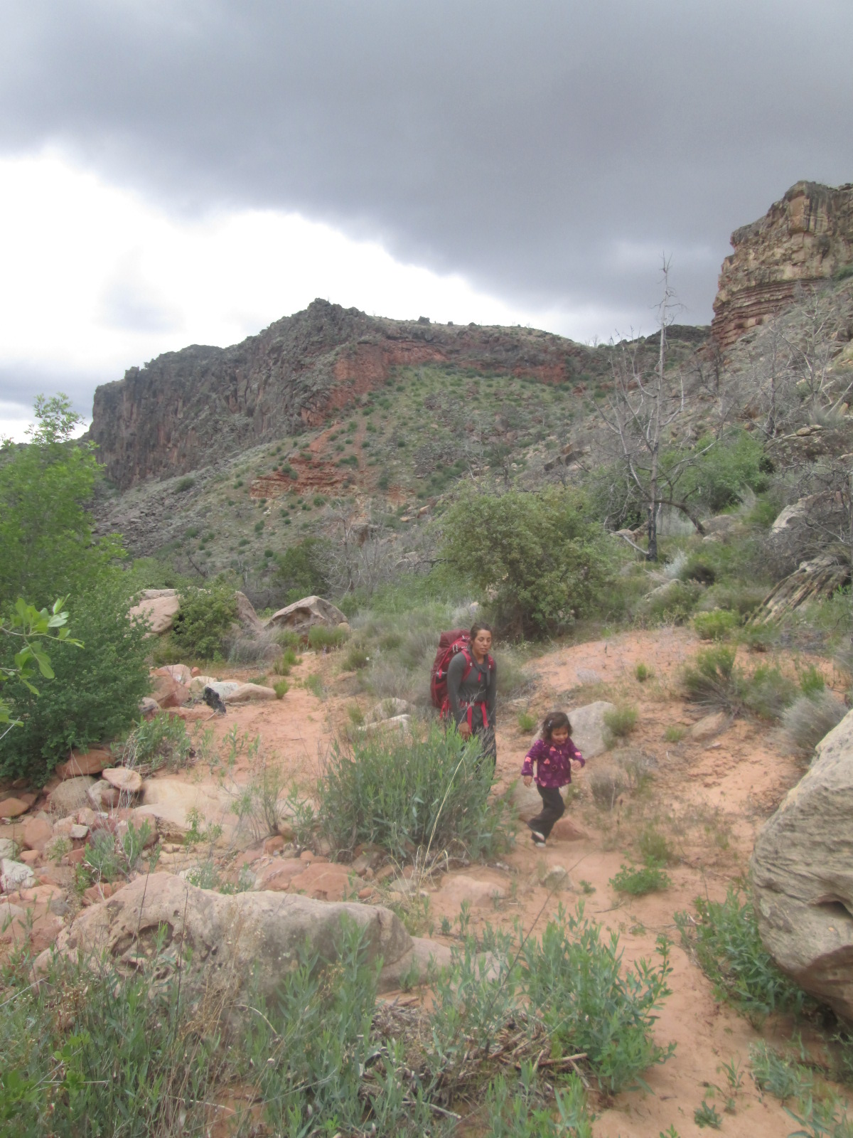 Elias, when reflecting back on the trip explains: “When I first started the backpacking trip I had butterflies in my tummy. It was so fun.” We saddled our packs while Ila searched for the perfect “stick hike” (read:. walking stick) and we were off strolling our two miles in to camp on flat ground hiking next to a dry creek. After about a mile we watched in wonder as this dry creek bed gave birth to a running river due to storms higher up in the mountains. Our careful planning to make sure we had enough water suddenly became irrelevant as the previously dry wash was now the key water and entertainment source for the remainder of the trip.