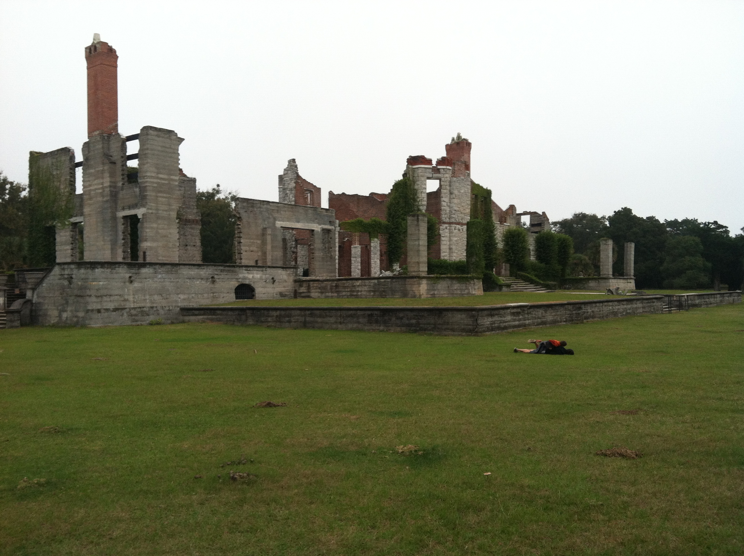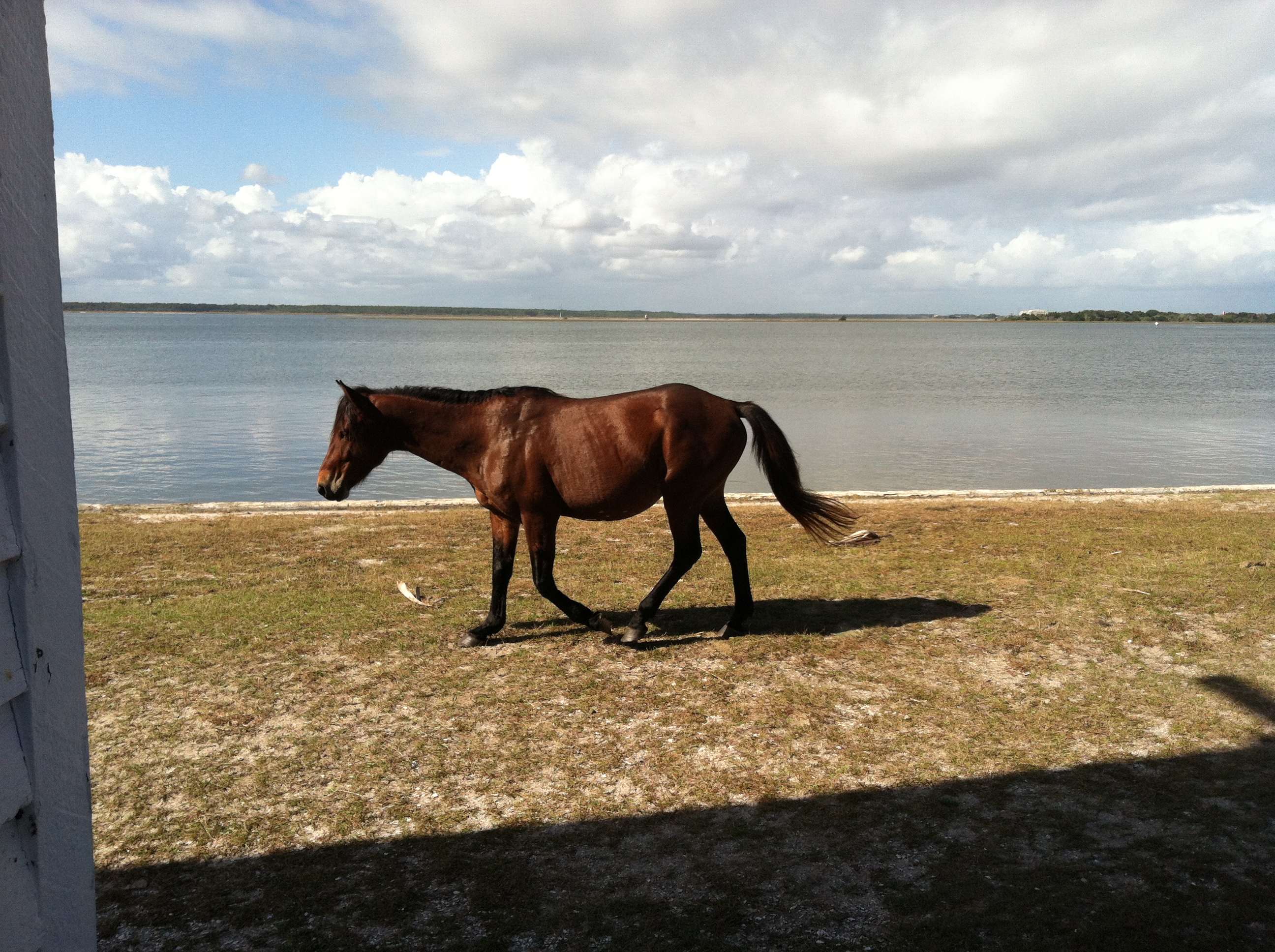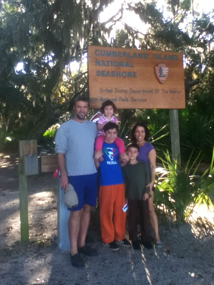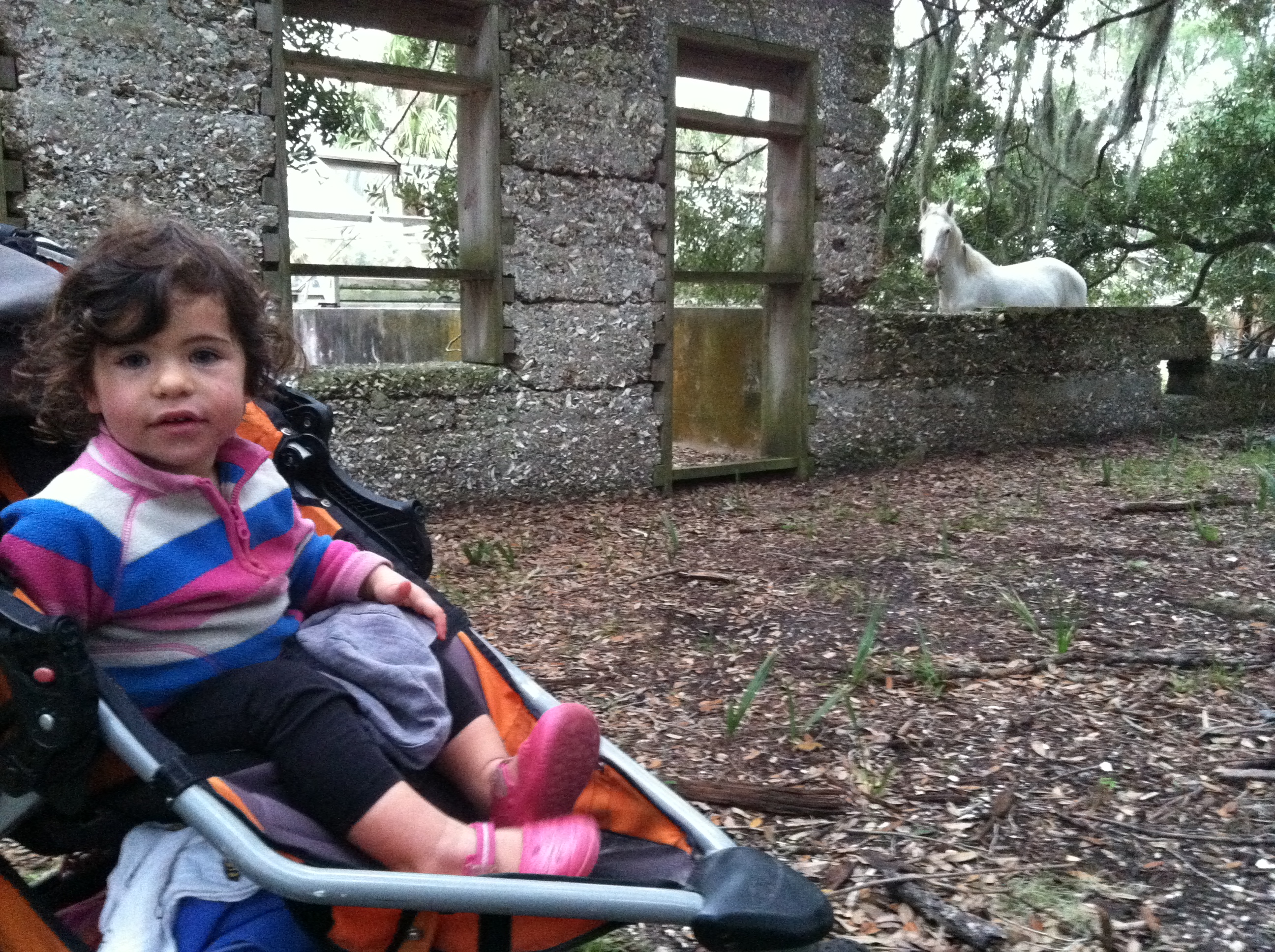Although the known human history of the island began 4,000 years ago with various native tribes followed by Spanish settlements in 16th and 17th, and then the English in the early 18th century, what remains on the island are a  series of very large estates in various stages of ruin sprinkled around the otherwise wilderness landscape.  These remaining ruins were built by the Carnegie Family.  The oldest and largest was a huge plantation that burned to the ground before the Carnegies rebuilt it even larger than before.  After the Great Depression it was burned to the ground once again.  As we walked onto the estate a heard of deer tending to the well trimmed grass stampeded off followed by a bunch of wild turkeys.  Soon after that the famous wild horses of Cumberland island started showing up.  One by one they would walk in from the forest or the marsh.  Ila was very pleased.  Even with Michelle and the boys beginning their stroll back towards camp, Ila would not leave.  The two of us stayed and watched the horses for quite some time. We were used to the well kept, well groomed horses living on the horse farm at uncle Frederic’s house. This was an entirely different animal. These horses were wild, a bit shaggy and breathtakingly free…sort of how we were feeling at this point in the trip.